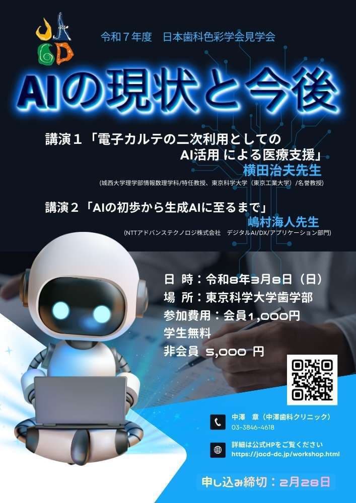 AIの進歩は第4次産業革命の到来ともいわれ、医療においても大きな変化が予想されています。しかしながら歯科関係者がAIの実態を理解するのは簡単ではありません。今年度の見学会では、まず城西大学の横田治夫先生から、電子カルテへのAIの活用についてご講演いただきます。横田先生は、「電子カルテデータ解析-医療支援のためのエビデンス・ベースド・アプローチ-」(共立出版)という著書で大川出版賞を受賞されております。次に、NTTアドバンステクノロジでAI事業を担当されている嶋村海人先生から、AIの初歩から生成AIに至るまでについてデモを交えながらご解説していただきます。